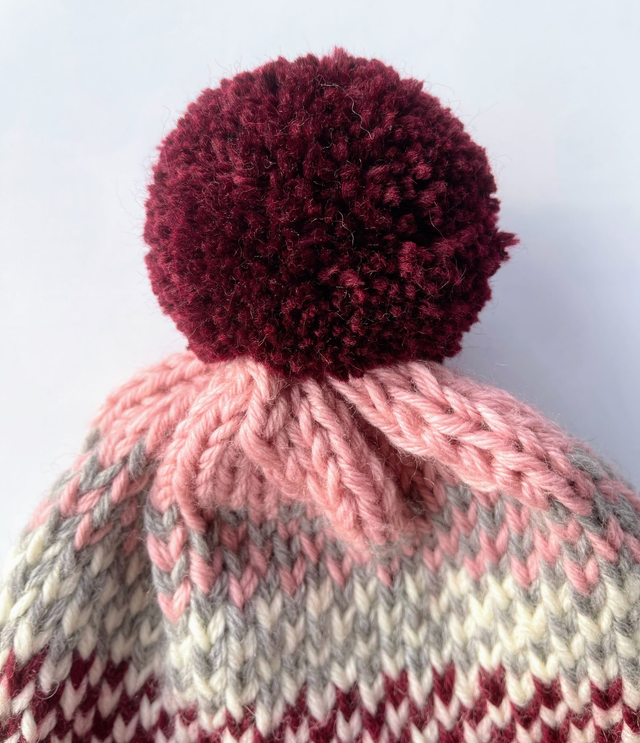 🎀 Duży pompon: włóczkowy pompon w kolorze głębokiego burgundu, efektowne i urocze wykończenie.