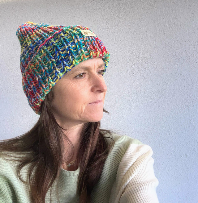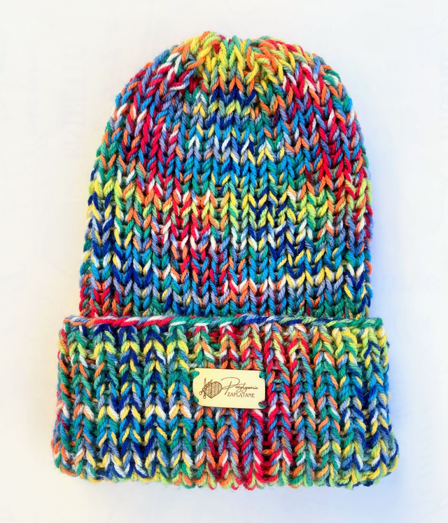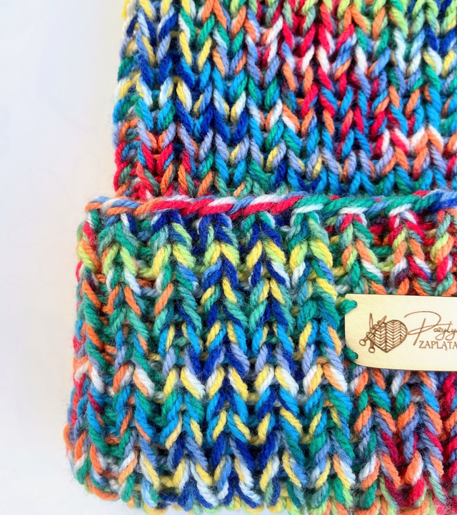 Świeżość i energia! Nasycone kolory — układają się w harmonijną, tęczową mozaikę przypominającą morskie fale w promieniach słońca. Czapka dla osób, które lubią kolory, ciepło i oryginalny styl.